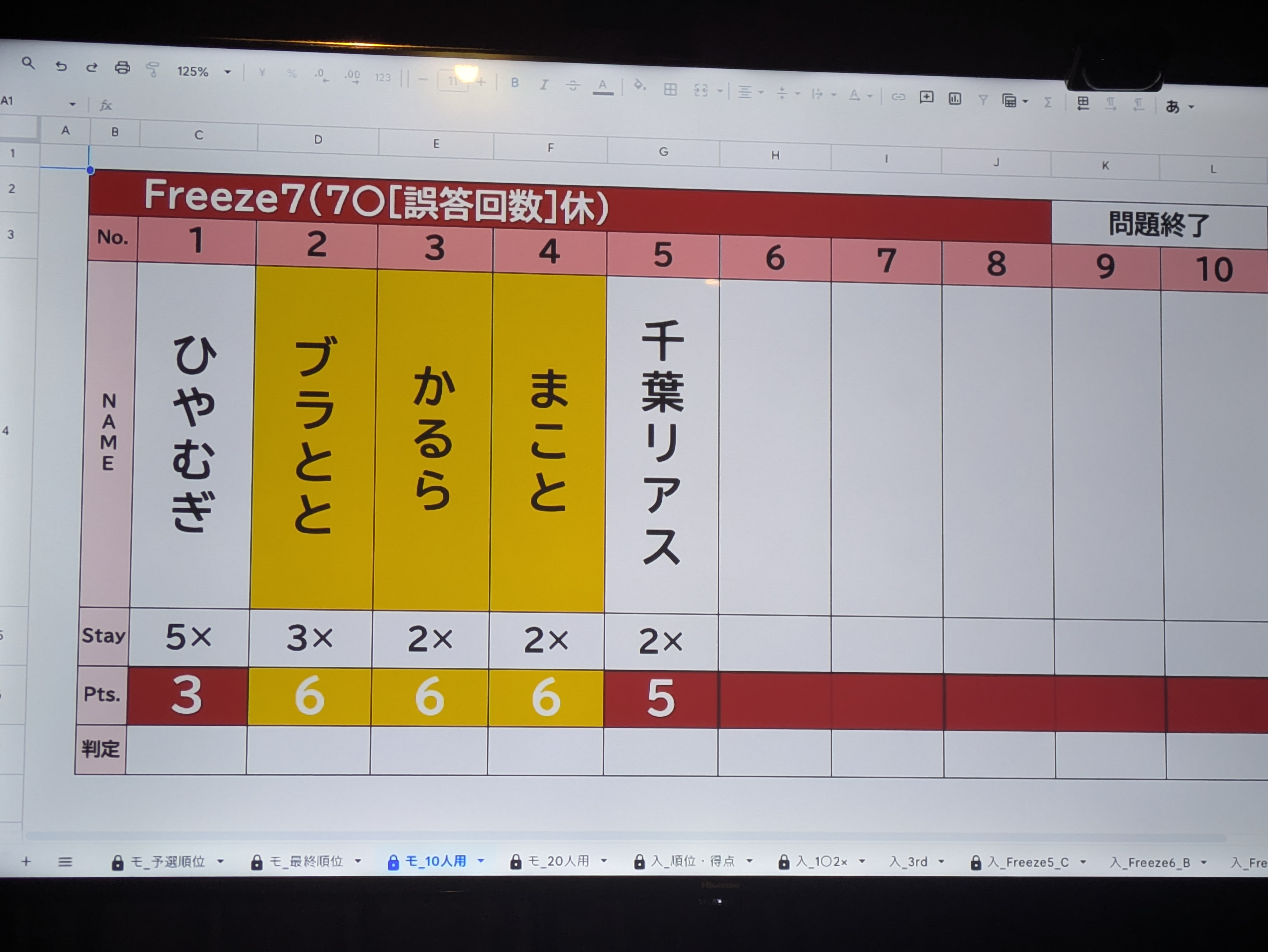37問目、6 vs 6 vs 6 vs 4 みたいになっていて、周りから聞こえてくる「まだ優勝あるぞ~!」 いやねえ俺(4点)、あるか?ほんまに?理論上はあるけどだいぶきちい~~